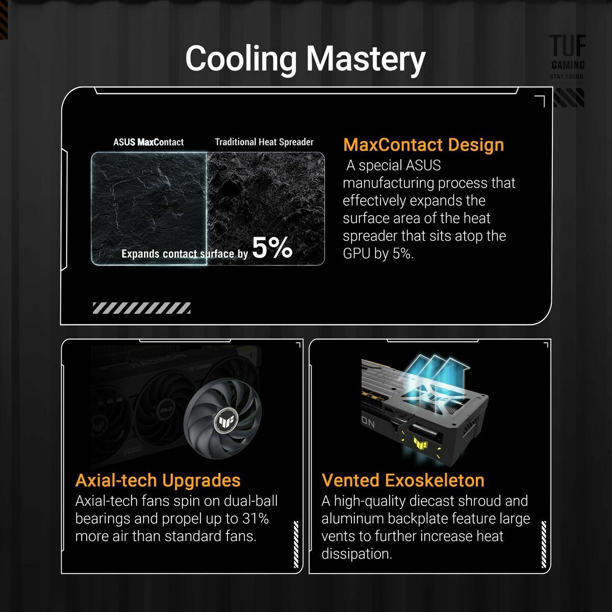 The Asus TUF-RX9070XT-O16G-GAMING graphics card is a powerful GPU component aimed at demanding users and gaming and content creation enthusiasts. It features the AMD Radeon RX 9070 XT graphics processor, delivering remarkable performance for tasks requiring high graphic capacity, thanks to its advanced architecture and support for the latest technologies. It includes 16 GB of dedicated GDDR6 memory with a 256-bit data bus, allowing it to handle complex textures and multiple graphic processes simultaneously without compromising smoothness. Its ability to reach a maximum resolution of 7680 x 4320 pixels makes it ideal for 4K and even 8K monitor setups, providing extremely sharp and detailed images in gaming, multimedia playback, and professional design. It supports current graphics APIs, including DirectX 12 Ultimate and OpenGL 4.6, ensuring compatibility with the latest titles and advanced graphic applications. Regarding connectivity, it offers multiple options with one HDMI port, three DisplayPort ports, and HDCP support, facilitating connection to various devices and guaranteeing protected content. Although compatible with the PCI Express 5.0 interface, this version is optimized to work perfectly on PCI Express 3.0 platforms, ensuring broad compatibility. Its active cooling system consists of three fans designed to maintain optimal temperatures even under heavy loads, while the multicolor lighting adds a customizable and modern touch to the setup. The Asus TUF-RX9070XT combines high-quality materials and components within Asus’s renowned TUF Gaming line, which prioritizes durability, stability, and sustained performance during long sessions. Overall, this graphics card represents an ideal solution for those seeking a balance between advanced graphic power, versatile connectivity, and an efficient cooling system for demanding environments.